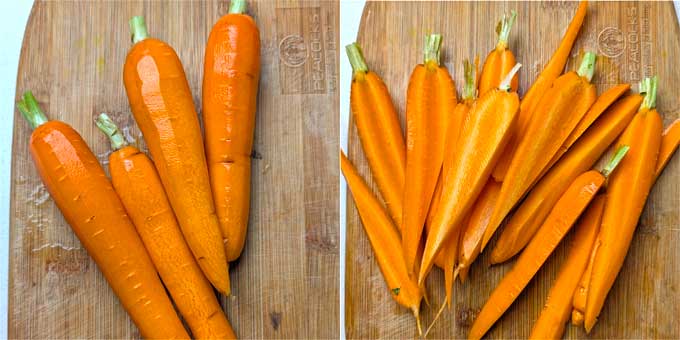 - Cut the carrots into uniform 3 inch diagonal pieces lenghthwise. For thicker carrots, cut them in half or quarters lengthwise so they are all roughly the same thickness. Uniformity is key for even cooking!