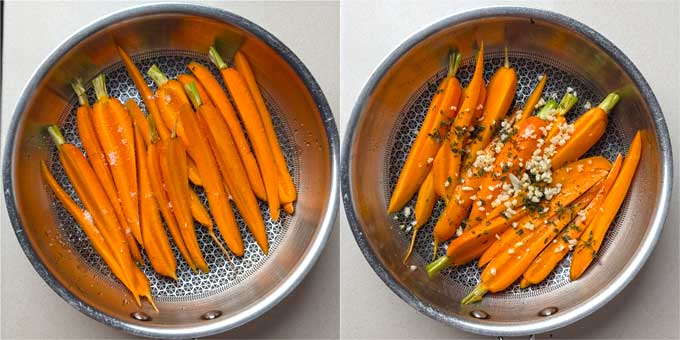 - Heat your cast iron grill pan or a stir frying pan. Spread the carrots evenly in a single layer. Do not overcrowd the pan; this is crucial for roasting instead of steaming.