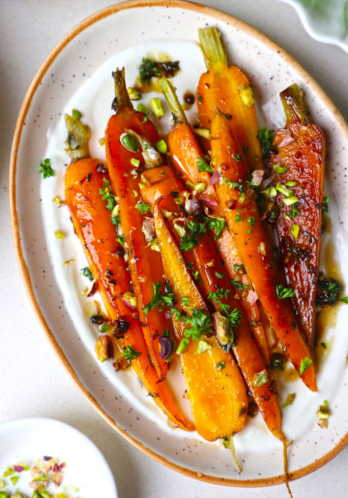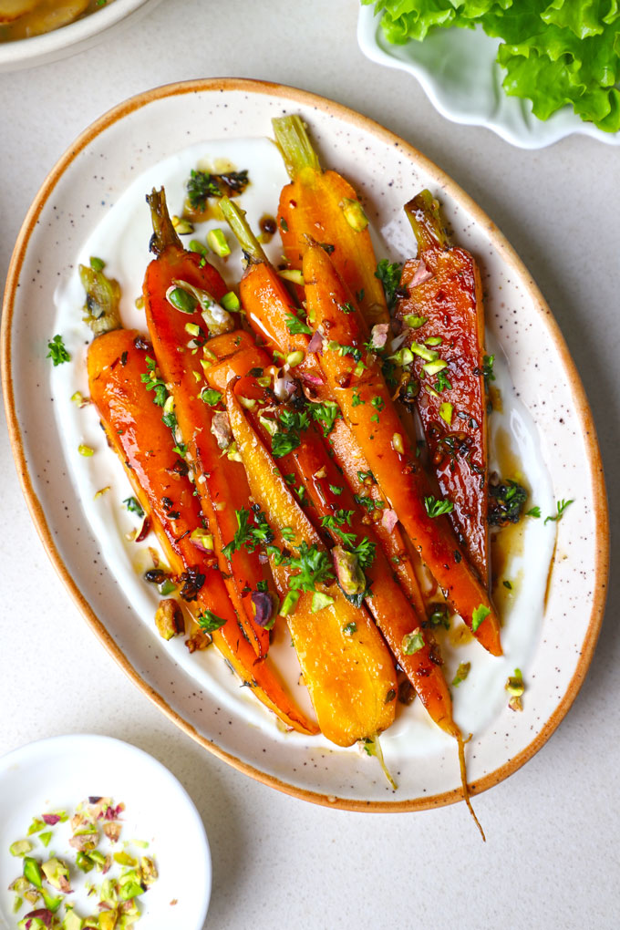 Serve roasted carrots with main dishes like Shepherd’s Pie, Cauliflower Steak, Pumpkin Pasta, or meat/steaks! They are always one of the popular holiday season side dishes. You can serve roasted carrots on a layer of plain Greek Yogurt or the Greek Cucumber Sauce for that creaminess.