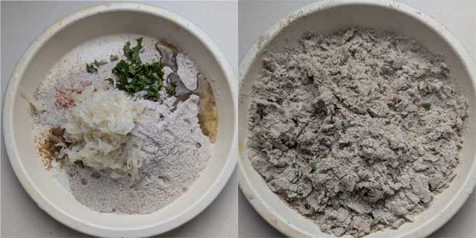 - In a large mixing bowl, combine the Kuttu flour, grated boiled potato, cumin powder, seeds, coriander leaves, and rock salt.