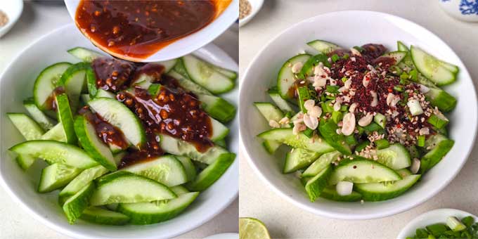 - In a large mixing bowl, gently combine the sliced cucumber, and the salad dressing. Sprinkle, sesame seeds, crushed peanuts, chopped green onion, and Gochugaru or smoked red paprika. Gently mix, making sure each piece of cucumber is coated with the sauce.