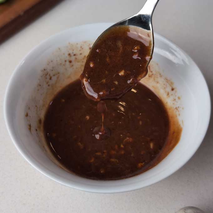 - In a medium bowl, combine the peanut butter, lime juice, soy sauce (or tamari), sugar, minced garlic, salt to taste, and sesame oil. Whisk vigorously until smooth.