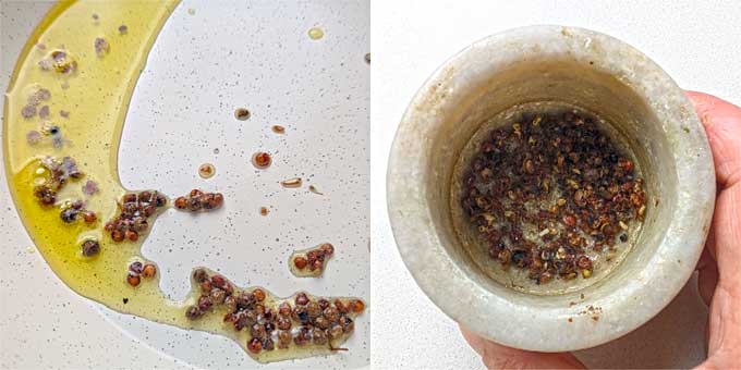 - In a pan heat oil, toast the whole Sichuan peppercorns for 1 – 2 minutes until fragrant. Be careful not to burn them. Transfer them to a spice grinder or mortar and pestle. Grind them. Set aside.