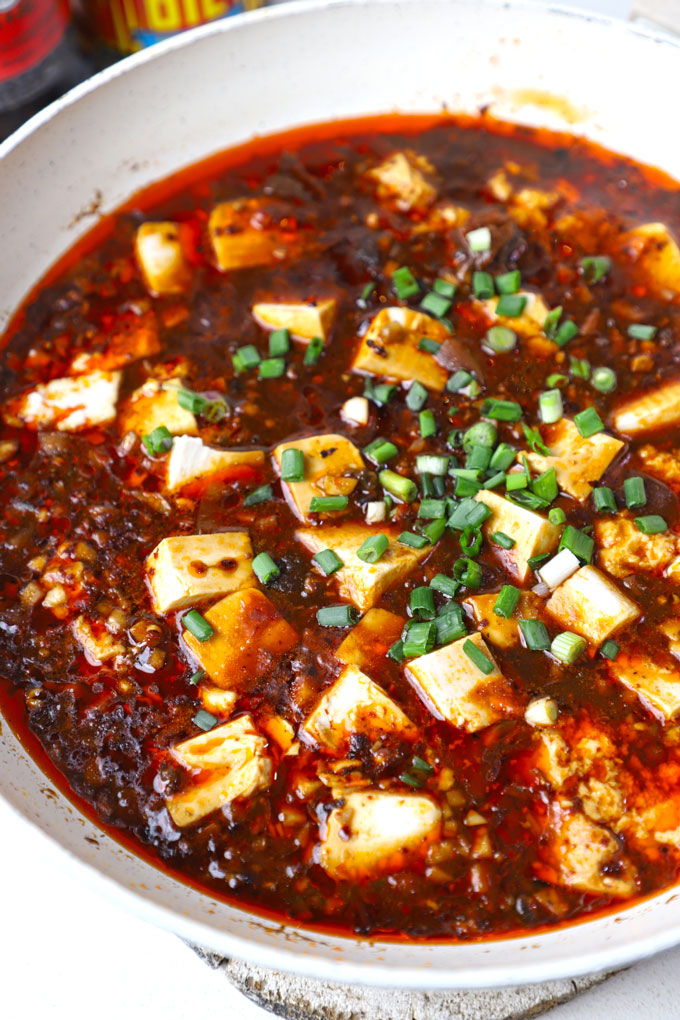 - Sprinkle chopped green onion and the mapo tofu is ready to serve!