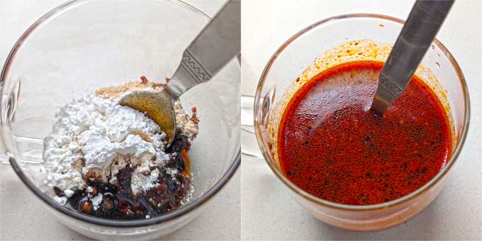 - Combine all the sauces, cornstarch, reserved shiitake liquid, and vegetable stock (bouillion cube/powder and water) in a mug/jar. Whisk to evenly combine. Make sure there are no lumps. Keep it aside.