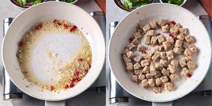 Heat oil in a large skillet or wok over medium-high heat. Saute ginger, garlic, and red chilli for 20 – 30 seconds to release aroma and infuse their flavour into the oil.