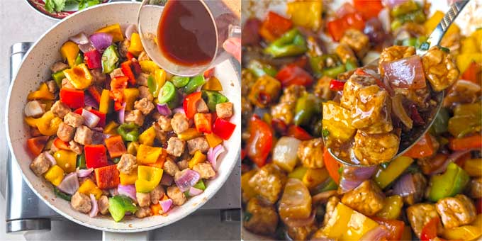 Pour it over the veggies and tempeh. Toss everything constantly for 1-2 minutes until the sauce thickens into a glossy glaze that coats every inch of the dish.