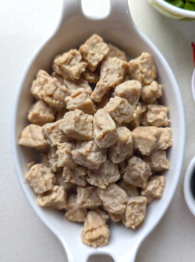 Tempeh cut into bite sized cubes.